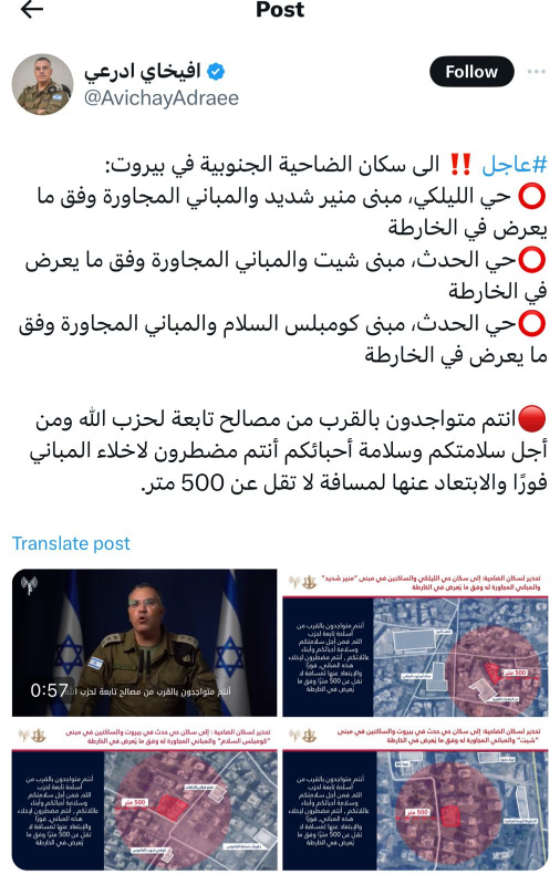 الجيش الاسرائيلي يحذر اهالي الضاحية حي الليلكي والحدث